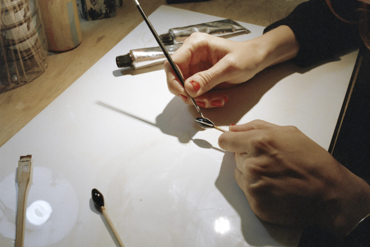 When it comes to the wooden necklaces, the first step is mixing the colors. Then, I sand the pieces and sometimes apply a layer of sealer. Afterwards, they’re lacquered with two, three or four layers, depending on the pieces. In some cases, they’re adorned with lines or other geometric motifs and, lastly, assembled in a chain.